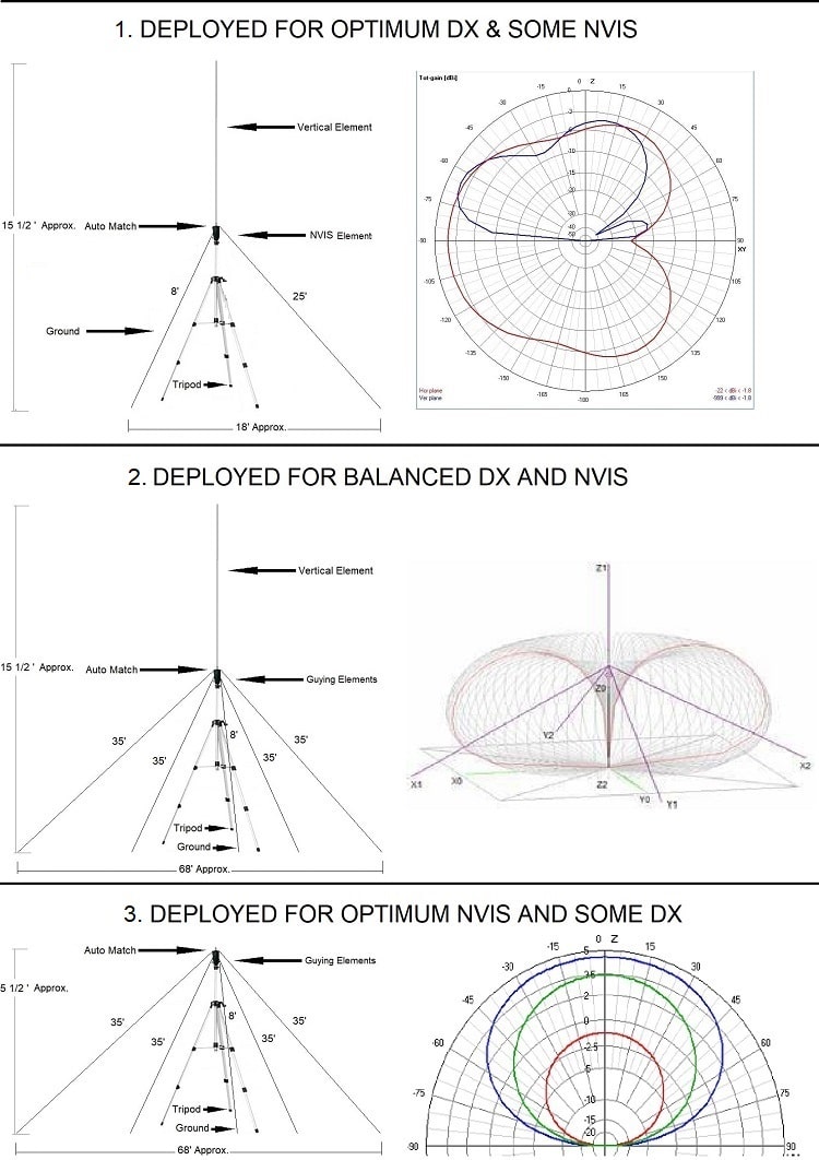 - Configuration a: Deploy the Auto Match at approximately 5 1/2 feet and install the Vertical & four 35′ NVIS Elements on the top of the auto match and one 8′ Ground wire towards the bottom of the auto match so that the NVIS Elements are deployed at 45-degree angles from each other to achieve the signal pattern shown in Figure 2.