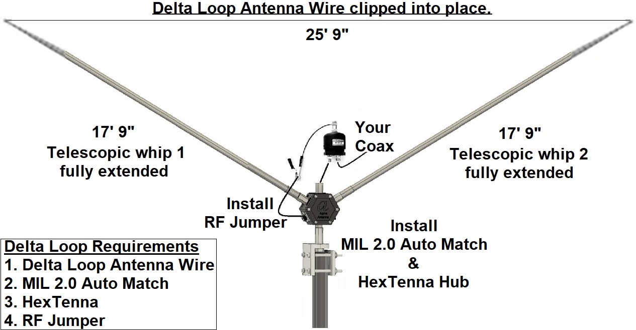The whips for the HexTenna Deluxe are telescopic, so as to enable you to adjust them for the band you are using. These whips are angled to change the naturally occurring 72-ohm dipole component to 50 ohms. This is not a ‘no tune all-band antenna’. For example, when deployed for 20 meters, it has two self-supporting telescopic whips that have a total deployed length of about 34 feet. The resonance is naturally occurring as you adjust the whips for the band you would like to operate on. Furthermore, when deployed on 40 meters, then this antenna becomes an M-Dipole that is 35 feet 9 inches on each side. The HexTenna can also be configured as a Delta Loop when the Alpha Antenna option for that configuration is purchased.